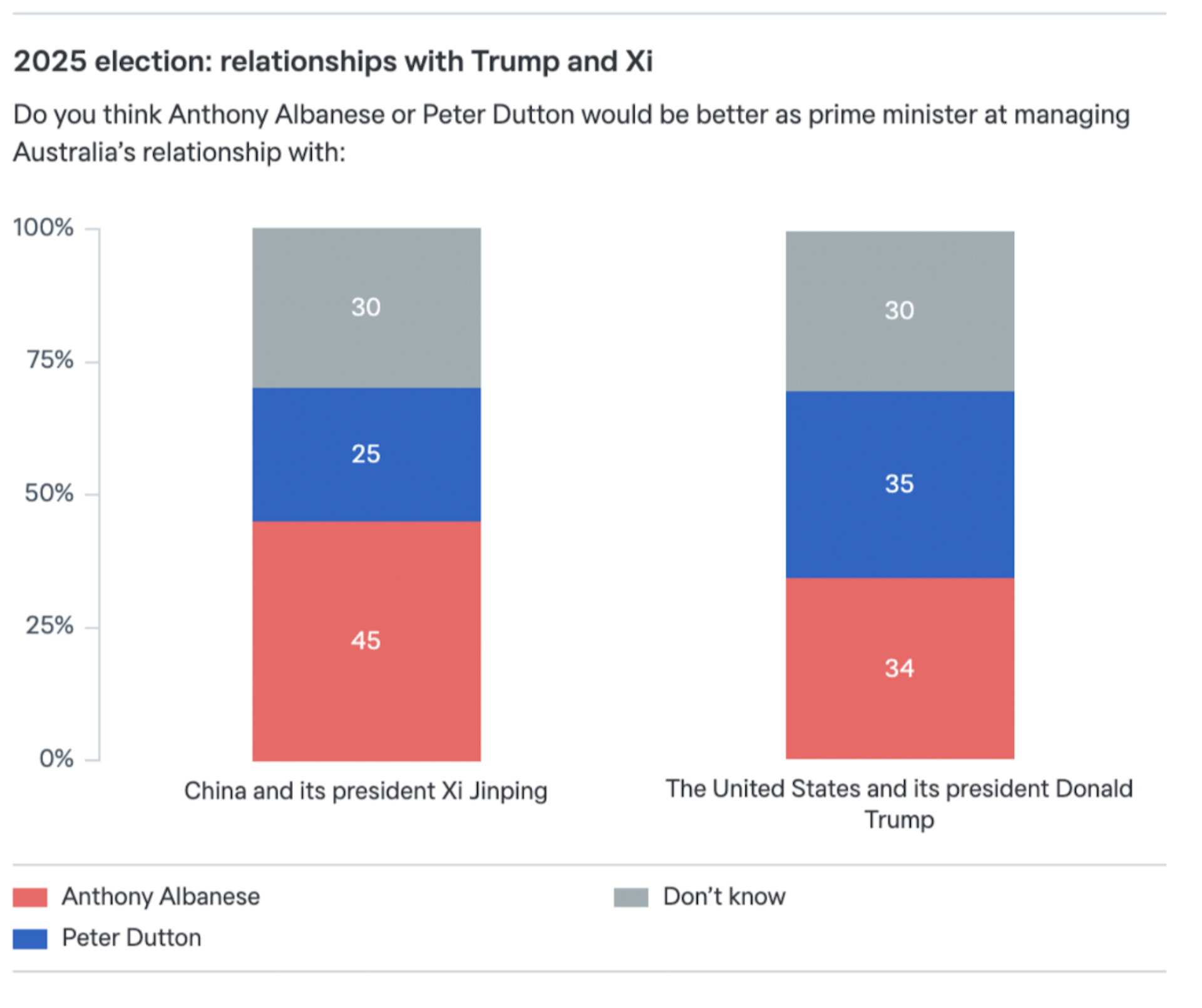 But Albanese rated much more strongly than Dutton as better able to manage Australia’s relationship with China and President Xi Jinping (45% to 25%).