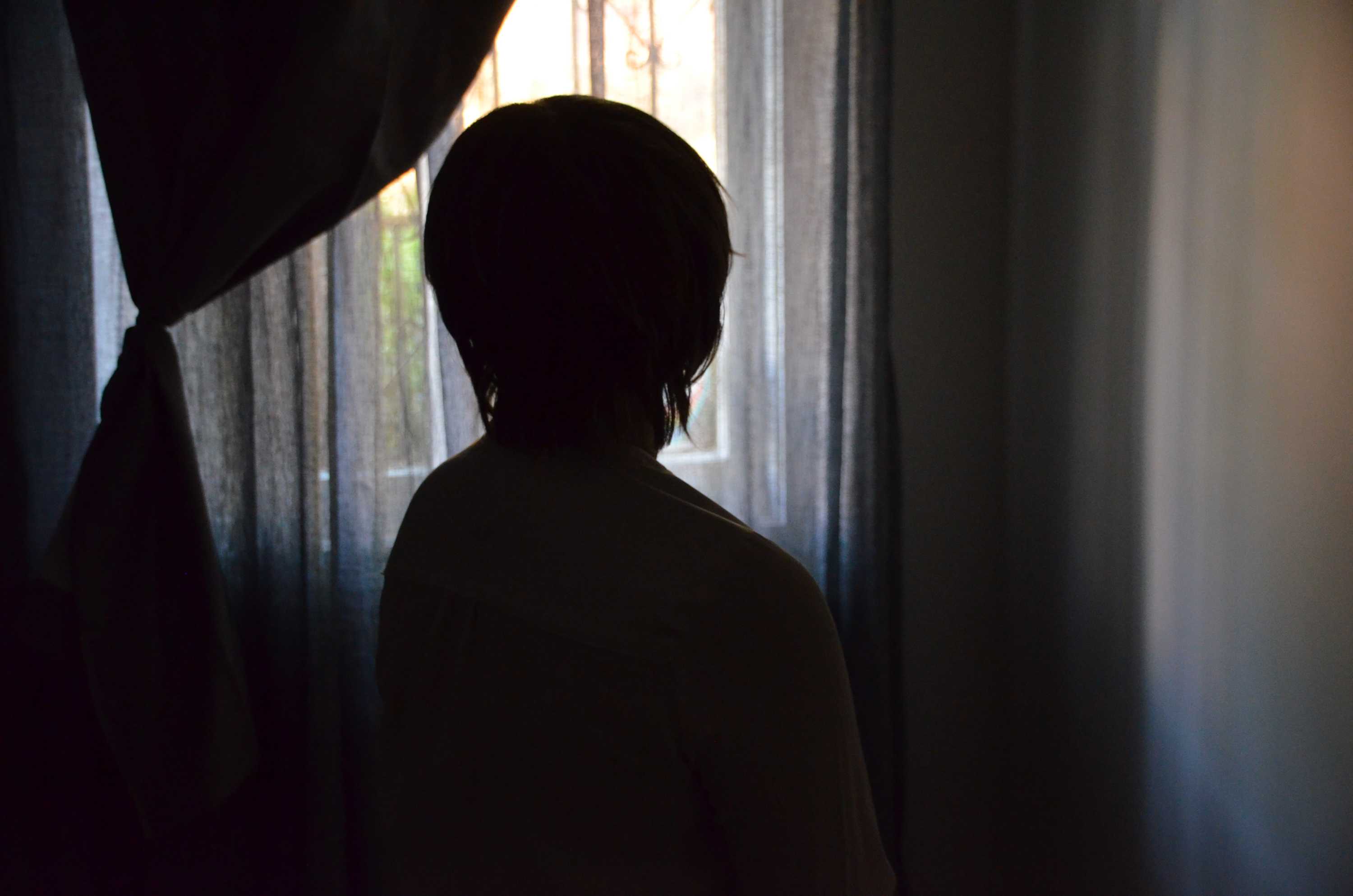 Photo shows A woman stands silhouetted in shadow inside a bedroom.