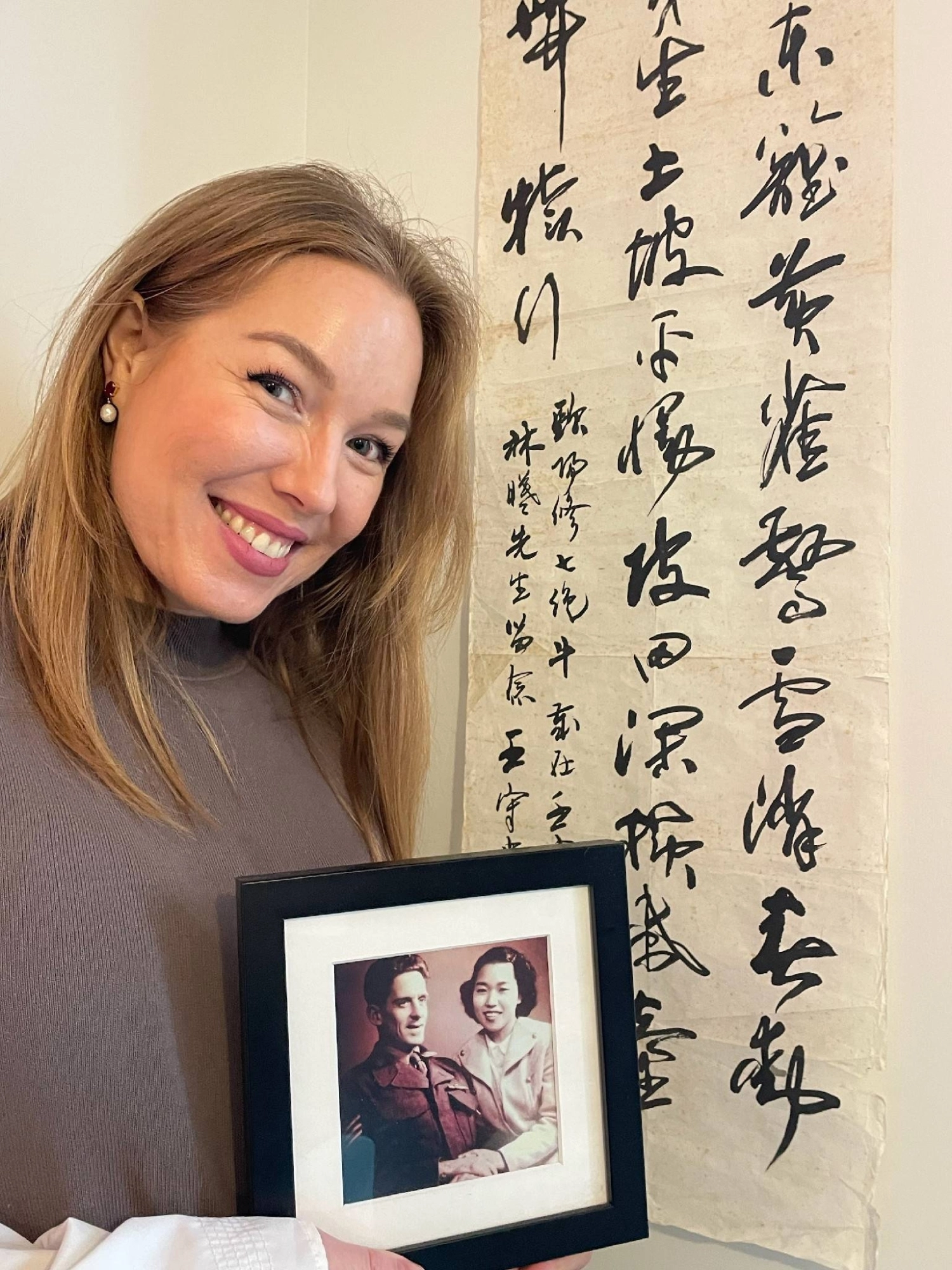 Elysha Rei stands in front of a calligraphy work by her grandmother, Akiko Kirkham, in Brisbane, Australia, on July 26. | JIJI